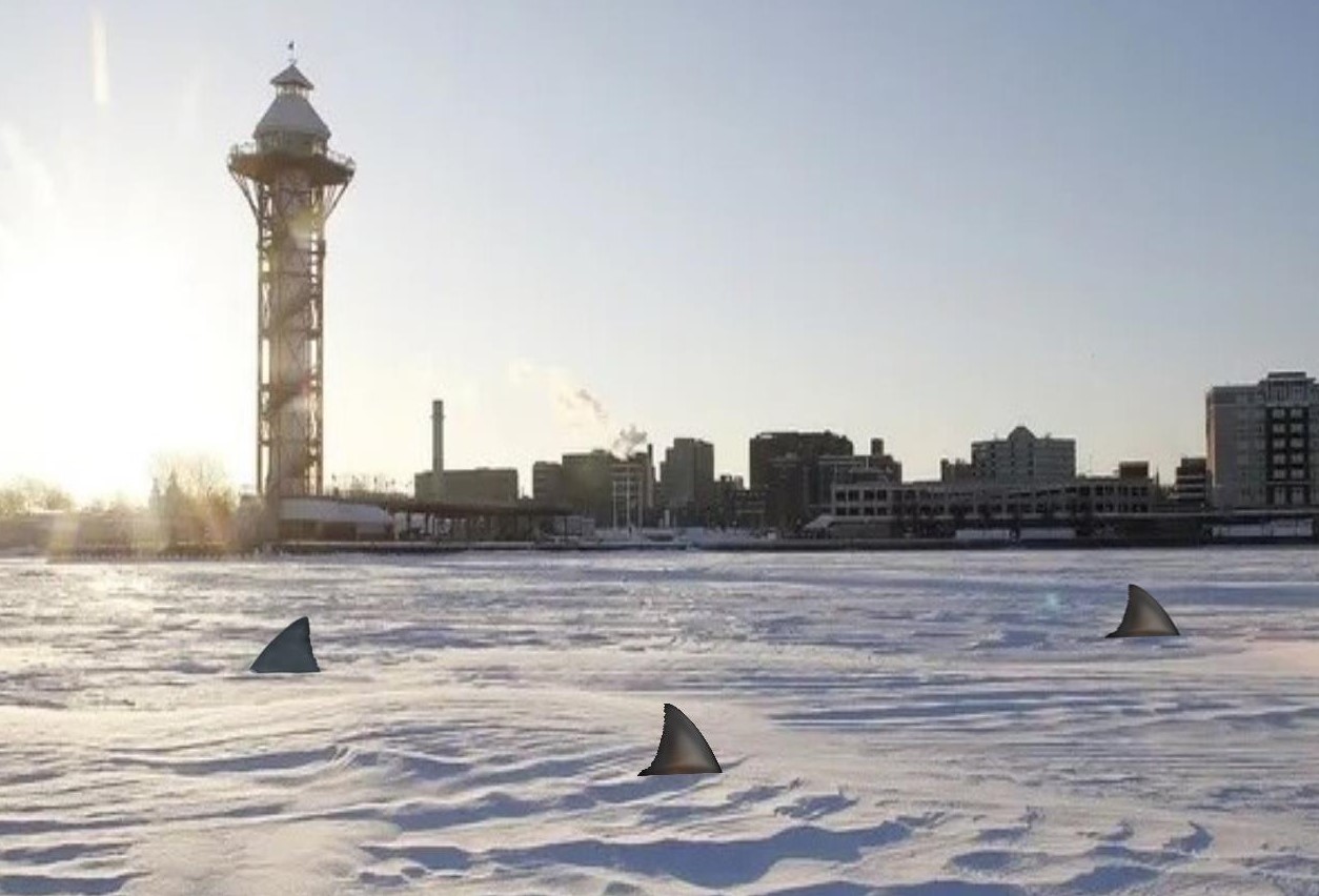 He went on to say that sharks have also become accustomed to cold temperatures. “What I’ve discovered is that the freezing water actually makes them bigger and stronger.” Dr. Gill is currently writing a thesis on Lake Erie’s Freshwater Great White Shark Population. “It’s gonna be big.” he tells us. “Career changing. I might even move up to the main campus! The REAL Penn State University. Microscope here I come! Oh, yes, and be careful out there. Sharks are deadly.”